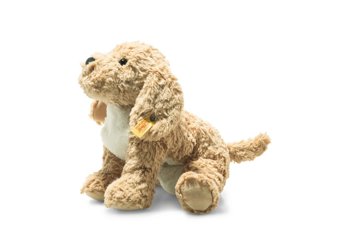Measuring 26 cm tall, Steiff’s Soft Cuddly Friends Berno Goldendoodle comes in a lying-down position with a slightly curly, beige-coloured plush coat resembling that of a Golden Retriever and Poodle. His white, smooth plush chest and tummy offer a lovely contrast. As both his middle and his distinctive brown plush paws are padded with little bean bags, Berno Goldendoodle always keeps his shape.